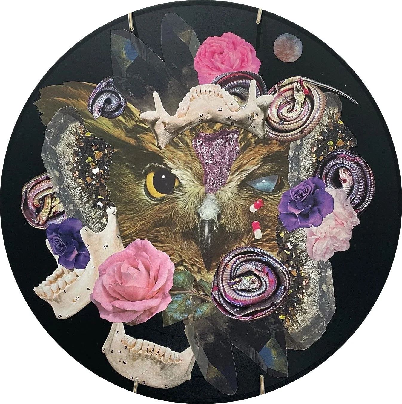 Side A: Arsenic / 2021 / Melody Jean Moulton / Collage on found vinyl record / 12 inch round / Available