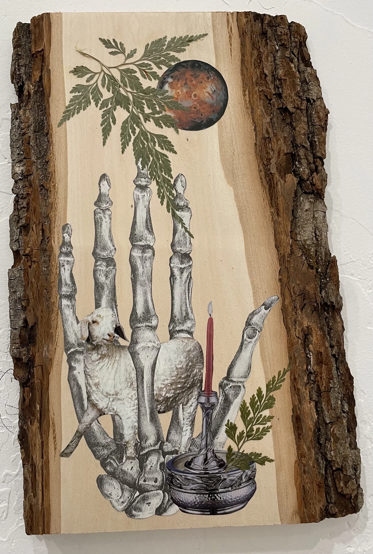 Inquietud / 2021 / Melody Jean Moulton / Collage: paper and pressed leaves on wood / 8.5 x 13 x 1 inches / Sold