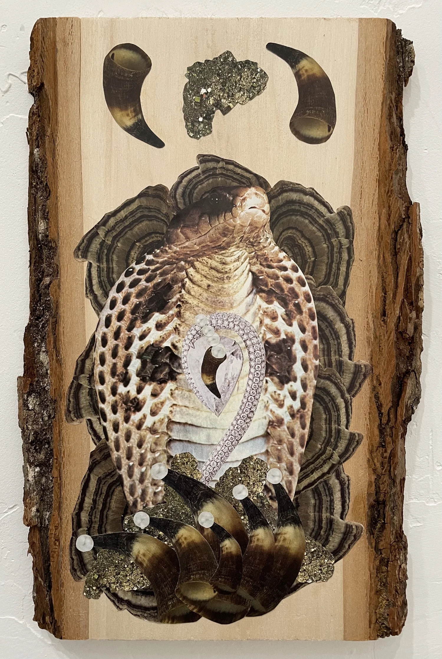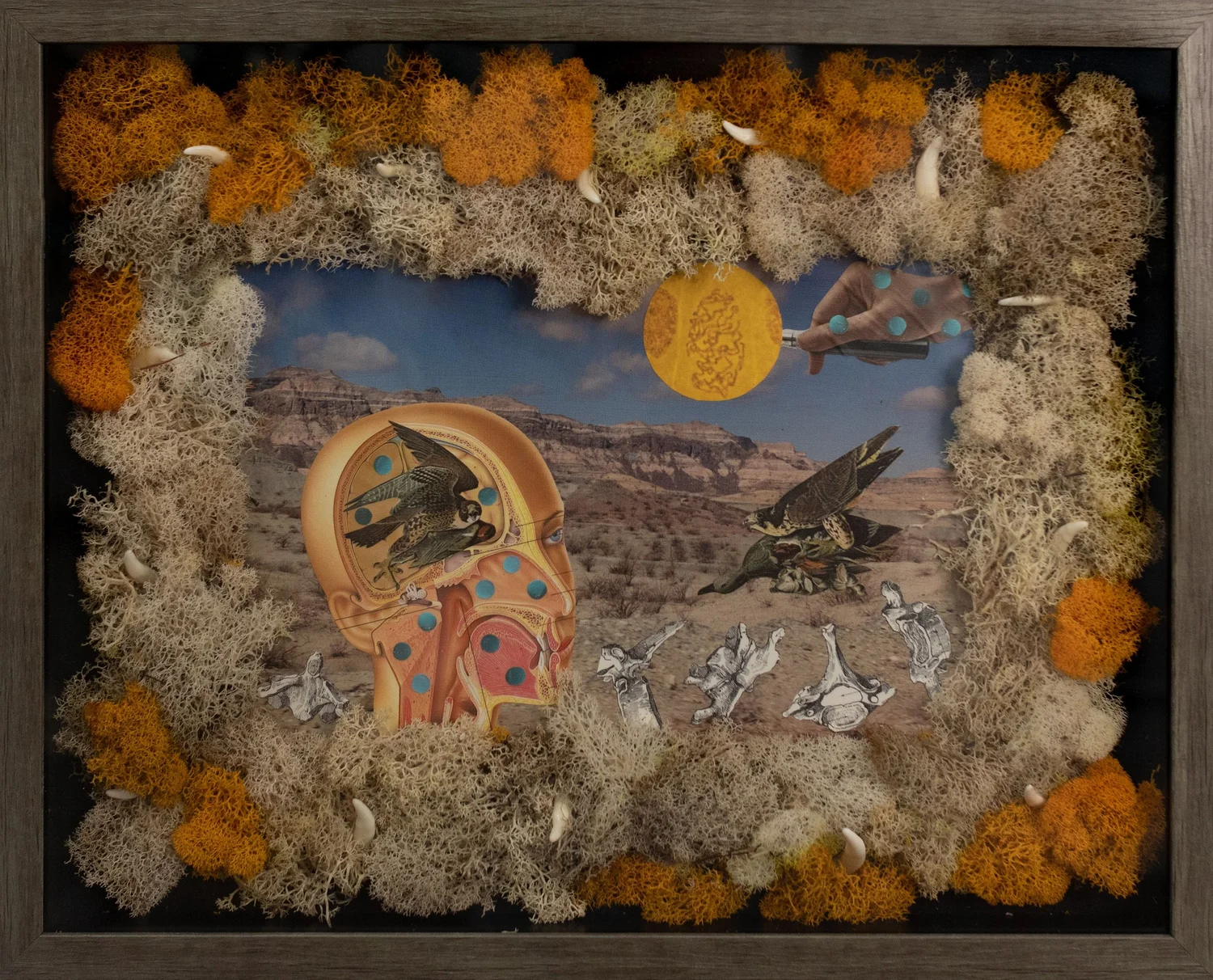 You Can't Have My Landmine / 2021 / Melody Jean Moulton / Collage on found photo, preserved moss, coyote teeth, hematite, scorpion in resin / 19 x 15 inches / Available