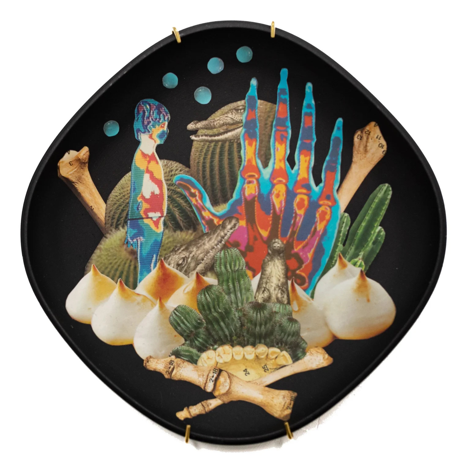 Pandemic Meals for One: Crocodile, Fresh Nopales, NyQuil Meringue / 2021 / Melody Jean Moulton / Collage on plate / 7.5 x 7.5 inches / Sold