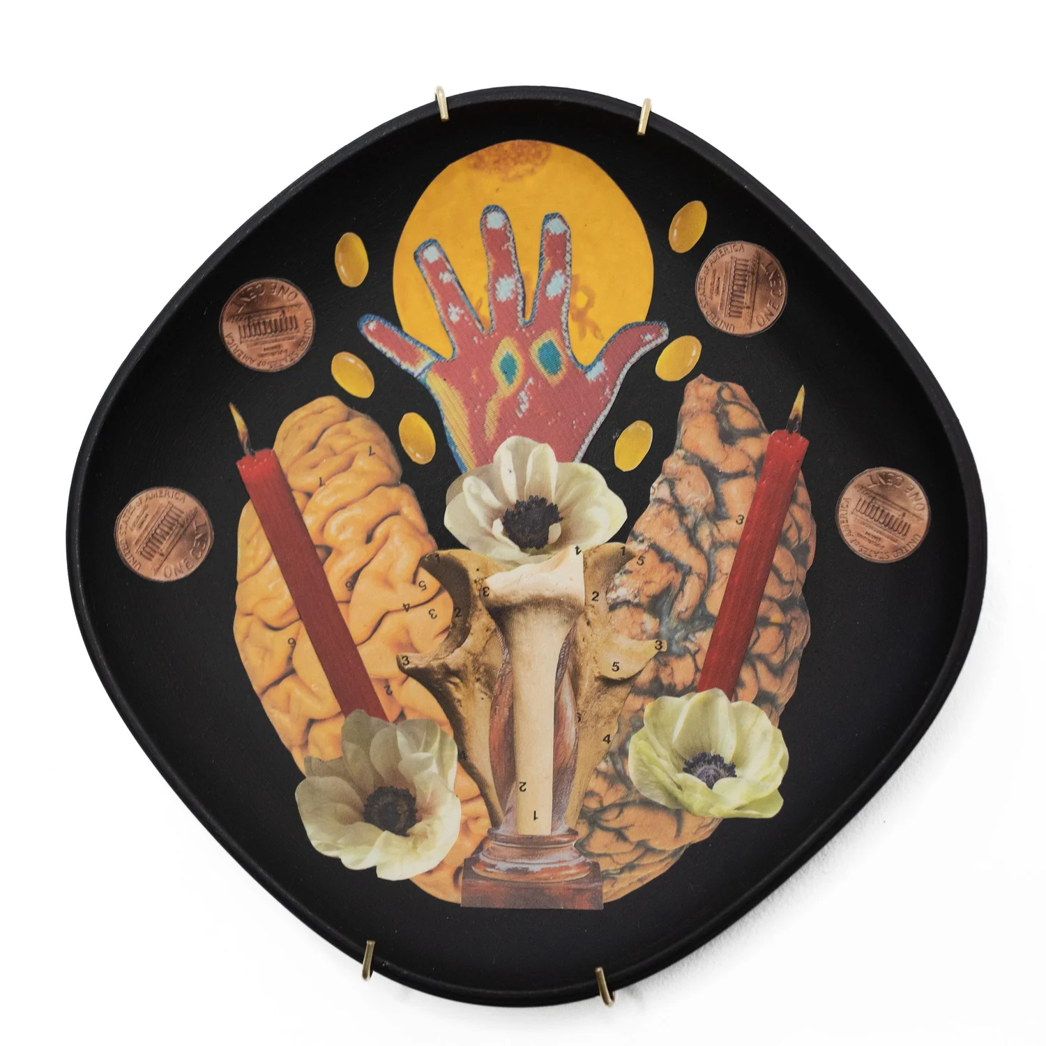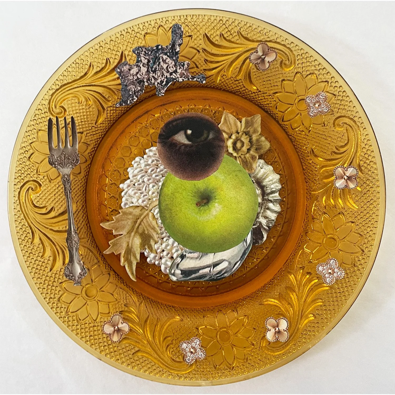 Pandemic Meals for One: Cracked Teeth, Deities, Lima Beans / 2021 / Melody Jean Moulton / Collage on found plate / 8 inch round / Sold