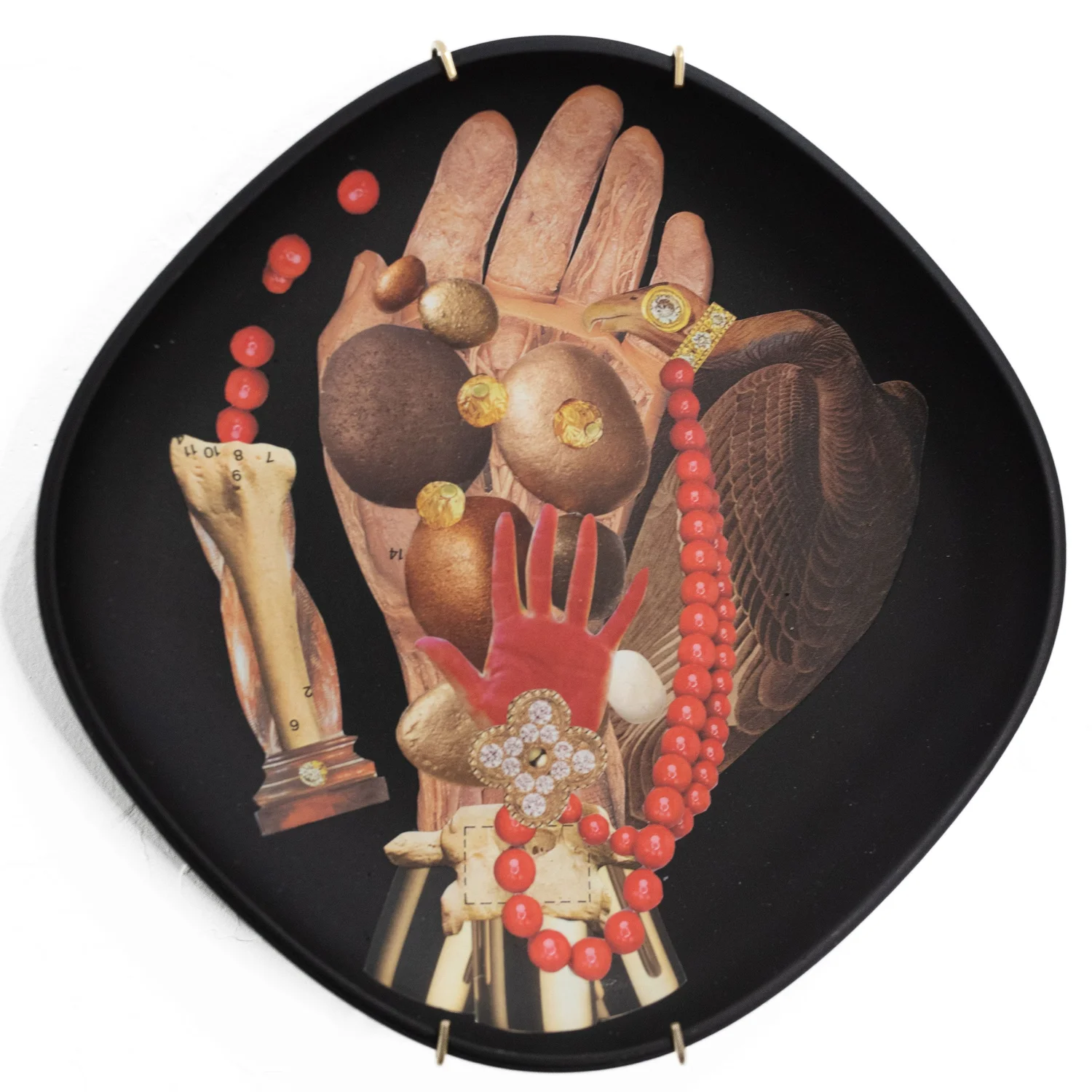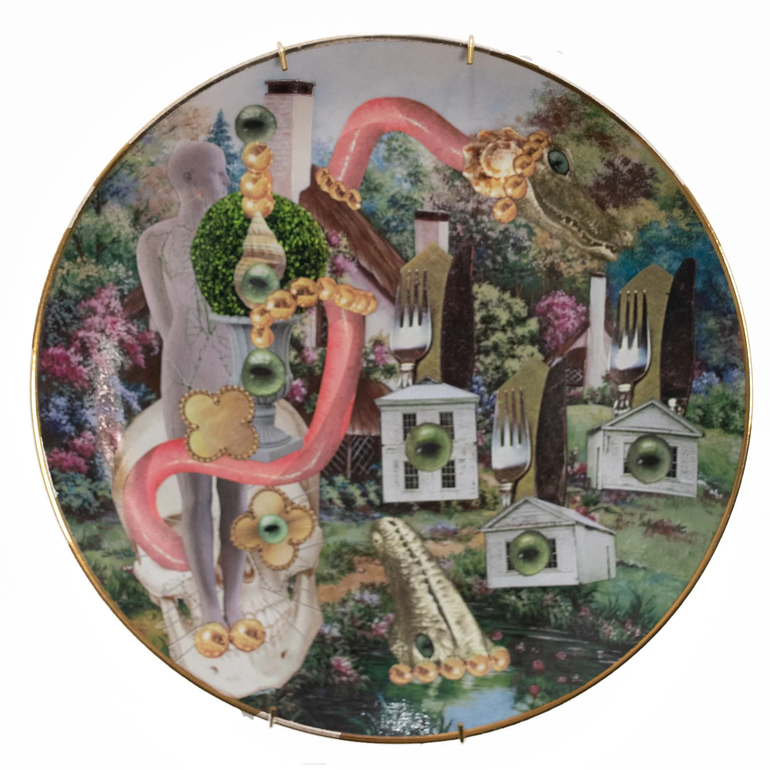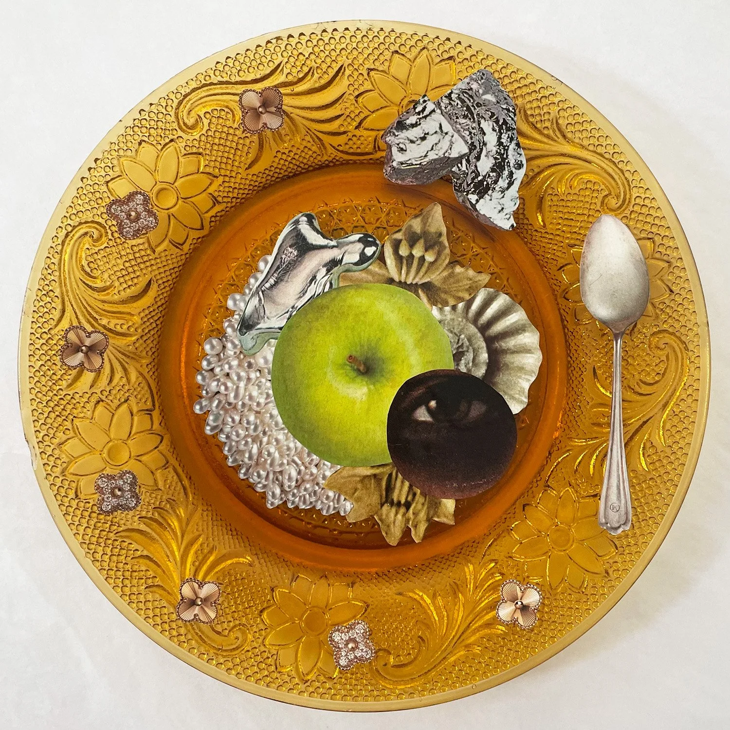 Pandemic Meals for One: Caviar, Ancestral Trauma, Gas Leak / 2021 / Melody Jean Moulton / Collage on found plate / 8 inch round / Sold