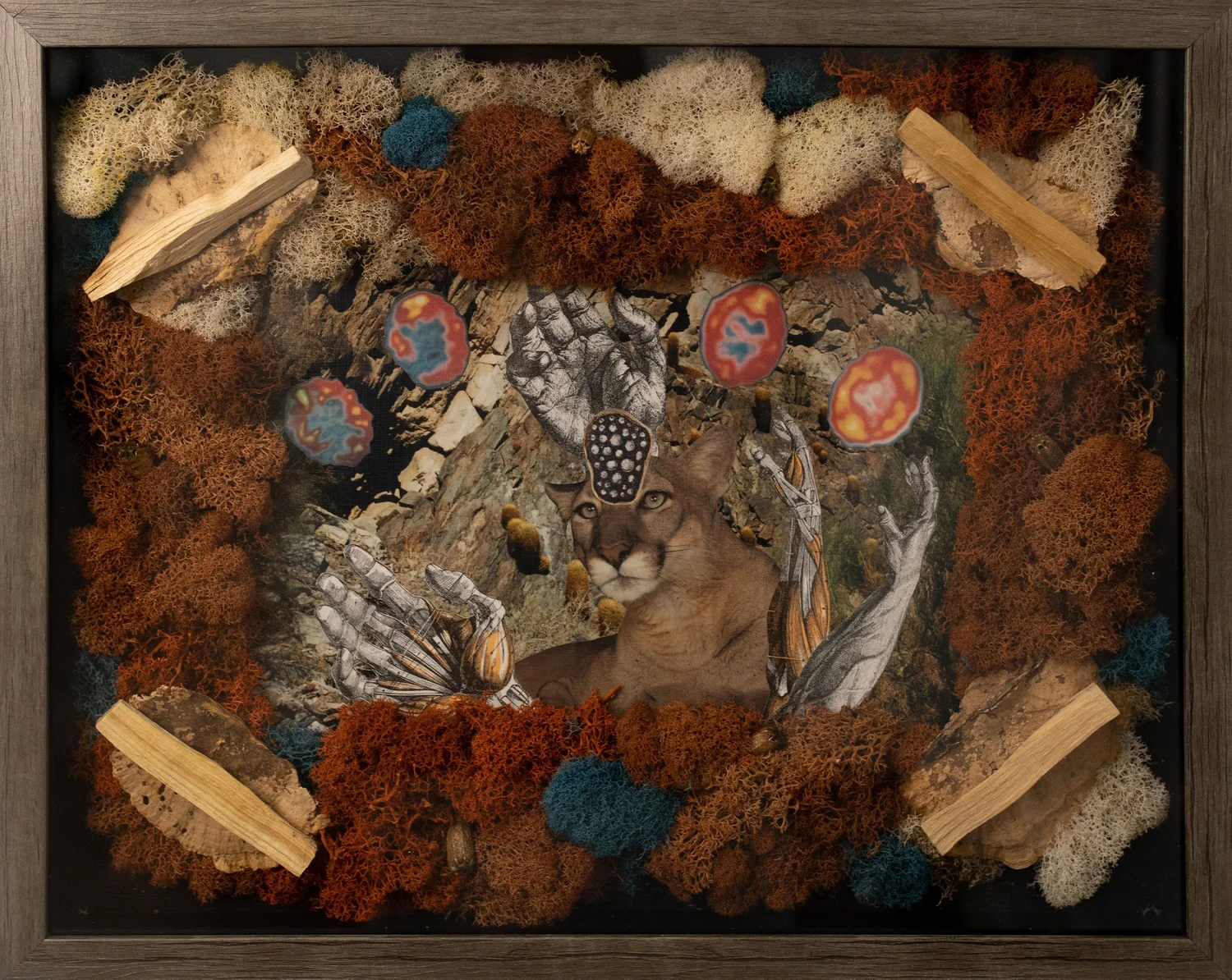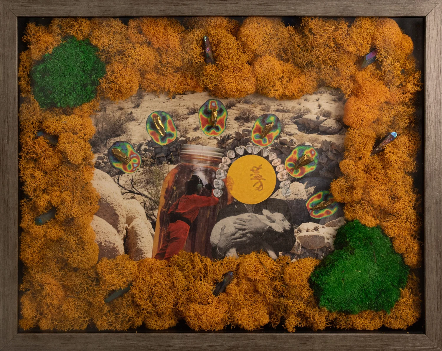 Trust Us, Its Good For You / 2021 / Melody Jean Moulton / Collage on found photo, preserved moss, mushroom, palo Santo, dead poppies / 19 x 15 inches (framed) / Sold